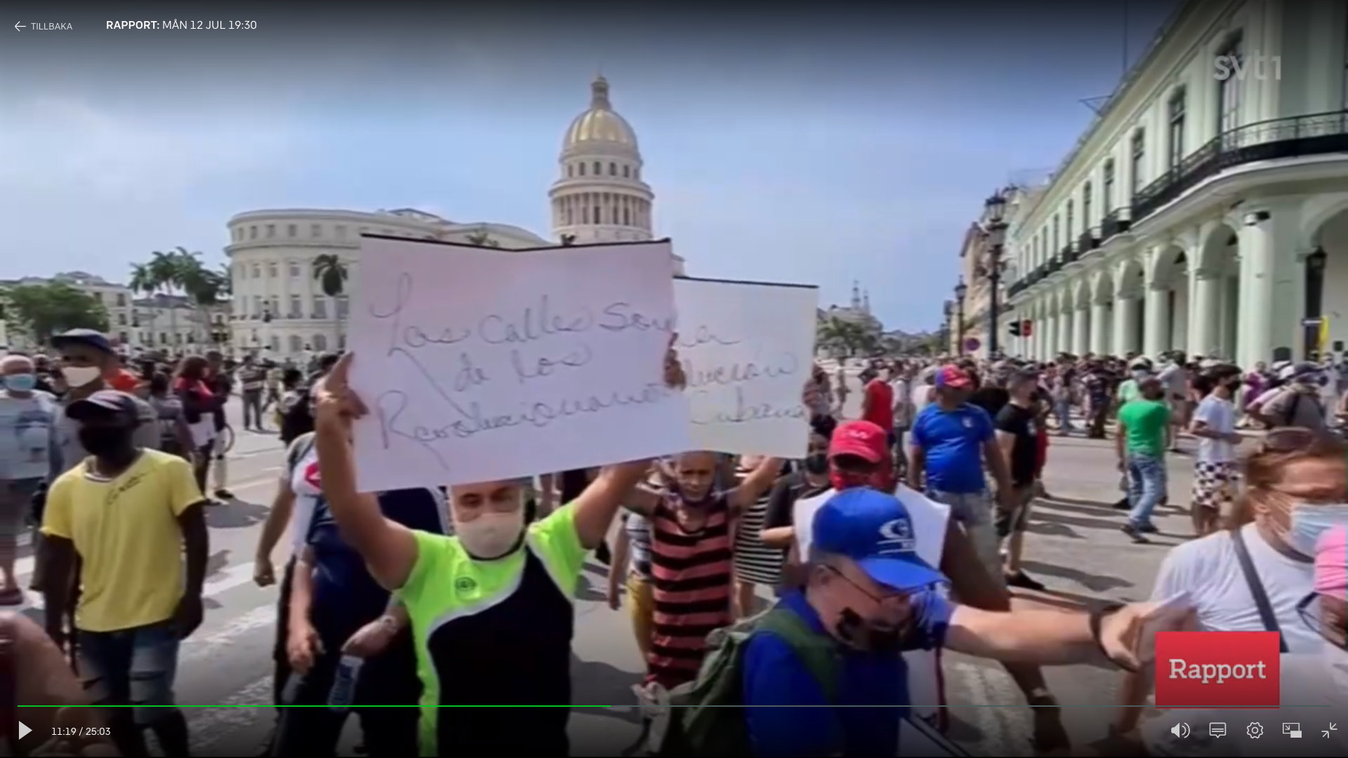 I en videosekvens står demonstranter med plakat med texten ”Las calles son de los revolucionarios” (”Gatorna tillhör revolutionärerna”). Det var just detta slagord som Kubas president Miguel Díaz-Canel använde i sitt tv-sända tal när han uppmanade folket att försvara gatorna mot kontrarevolutionärer och infiltratörer. Det är alltså högst rimligt att demonstranterna i just denna sekvens demonstrerar till stöd för regeringen – men det valde SVT att tala tyst om.