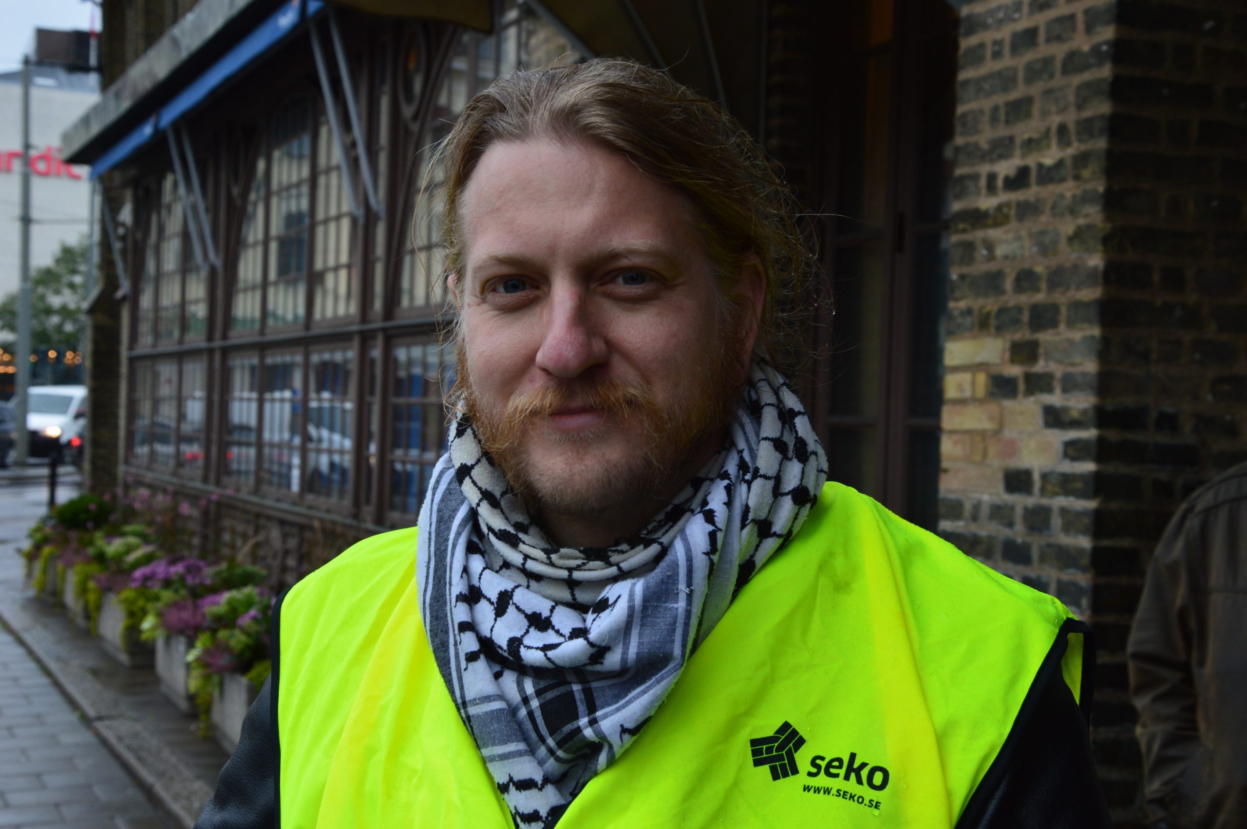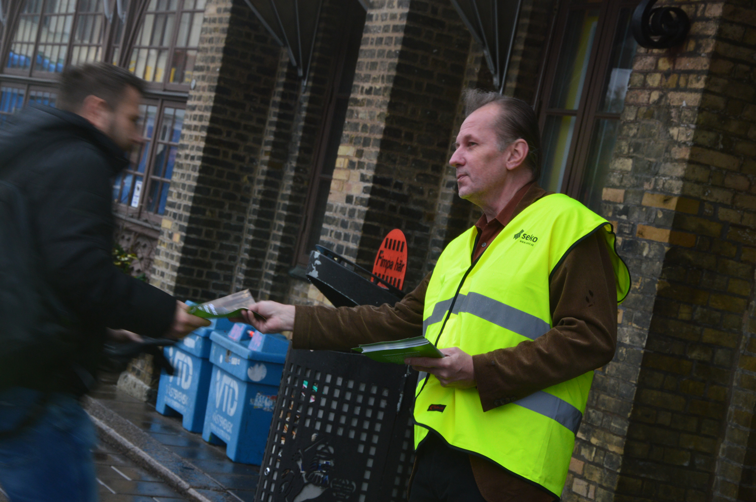 Han delar ut flygblad utanför centralstationen i Göteborg tillsammans med andra från Klubb Västtåg och Klubb SJ.