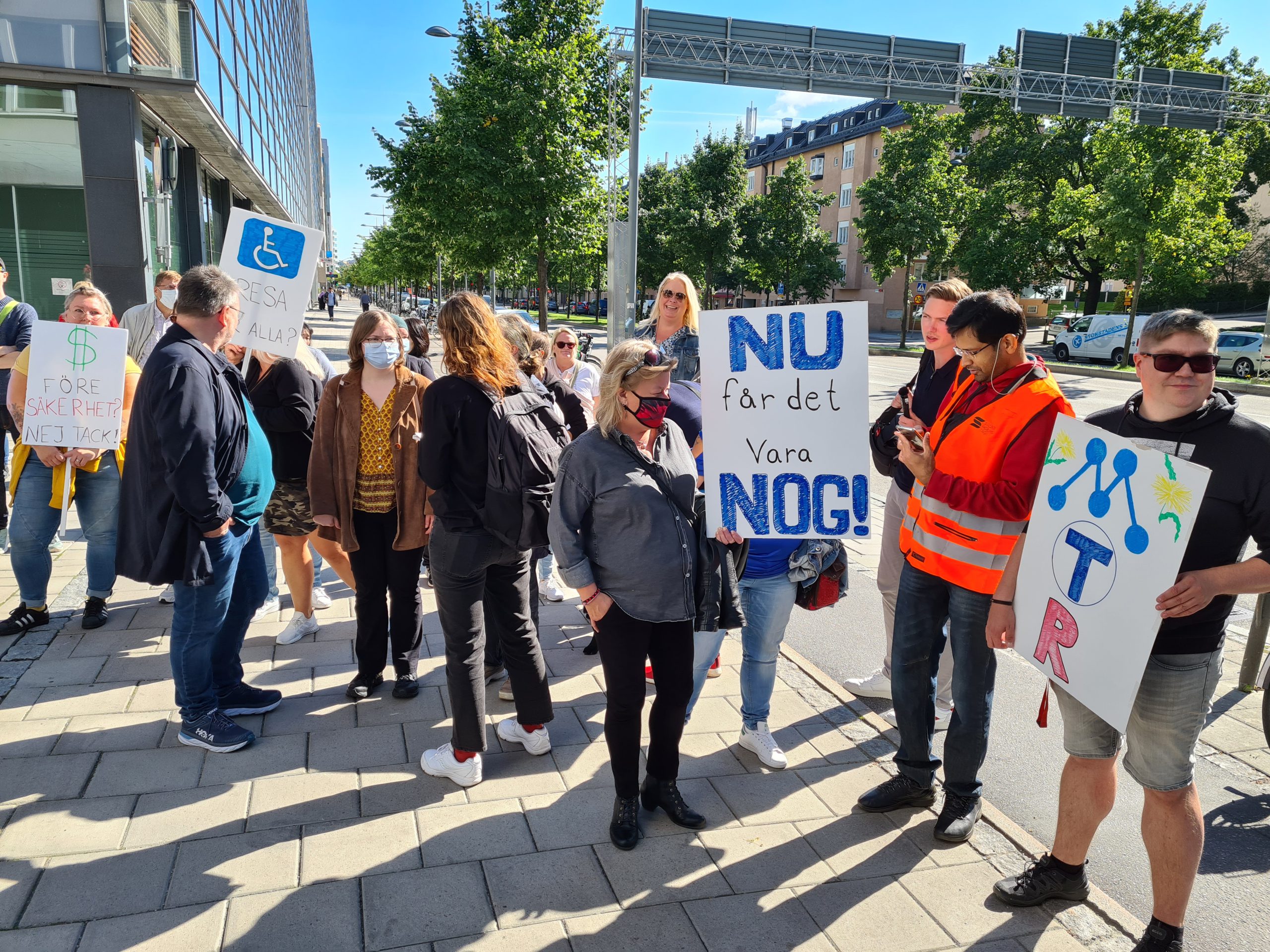 Det var tåg- och stationsvärdar, pendeltågsförare, kundservicevärdar och städare som samlades utanför SL:s huvudkontor på Lindhagensgatan på Kungsholmen för att uttrycka sitt missnöje.