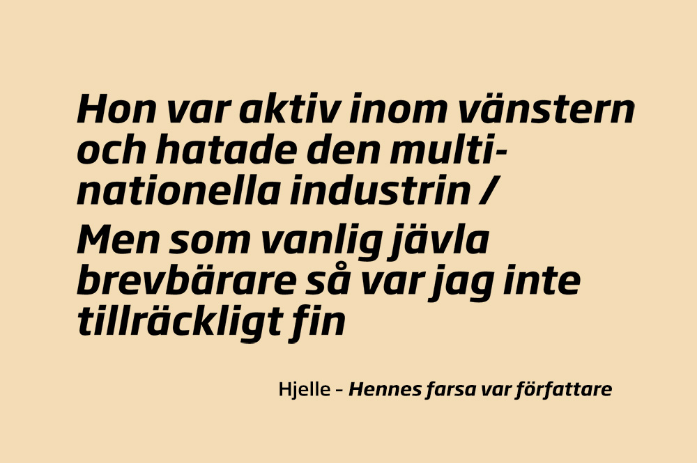 – Man vill ju hitta stöd i musiken. Man kanske haft en skitdag på jobbet… då vill man bara höra någon säga att alla är dumma i huvudet. Men jag tänkte att det där med att känna sig otillräcklig, och att få lov att vara dålig och medelmåttig, det hör man inte så ofta. Det finns hundra låtar som säger ”jag är bäst, du är bäst”, men rätt få som säger att det är okej att vara medelmåttig. Jag vill höra såna låtar. Så då skriver jag dem.