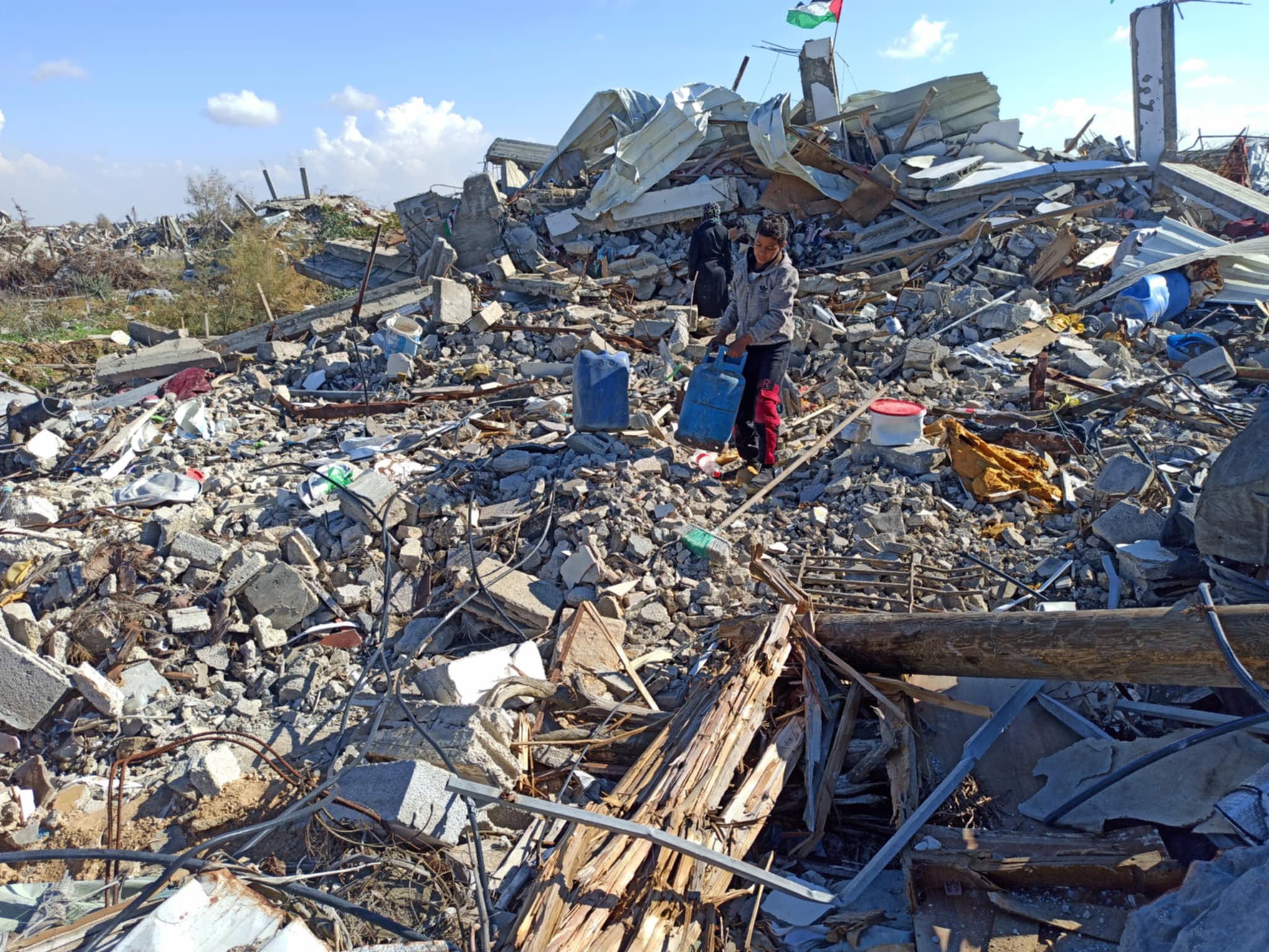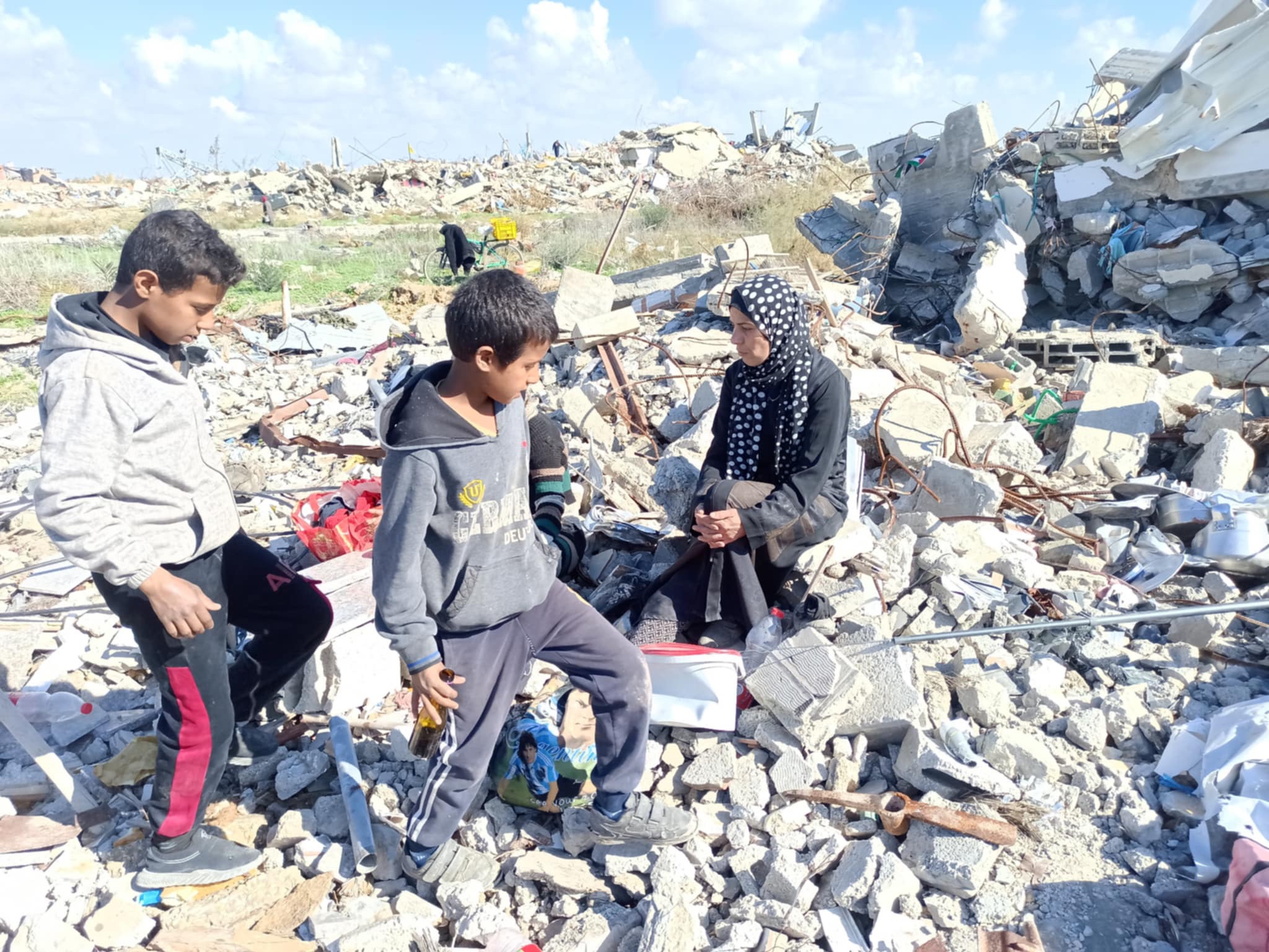 Trots allt detta väntar vi på att få stanna vid ruinerna av våra hem. Israels armé har retirerat stegvis och står nu bara hundratals meter bort. Men vi har funnit farliga föremål som lämnats kvar av ockupationsmakten, sprängladdningar som hotar våra barns liv. Utöver bristen på bostäder har vi inte ens tält eller transportmedel. Vi har varit utan elektricitet i 14 månader och har svårt att få tag i vatten.