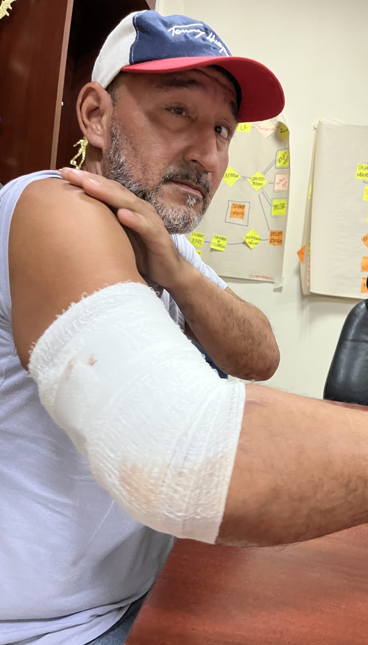 Han är nyss släppt från sjukhuset där han fått armen opererad och sydd med femton stygn, när han i byggfacket Suntracs lokaler berättar om de där timmarna på onsdagsmorgonen.