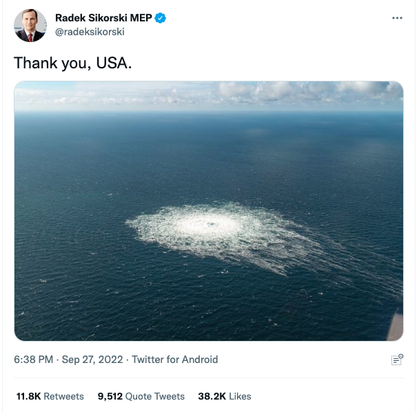Det var den ärliga reaktionen från Polens tidigare försvars- och utrikesminister Radek Sikorski på nyheten att gasledningarna Nordstream 1 och 2 utsatts för sabotage. Det var på Twitter som Sikorski – som sitter i EU-parlamentsgruppen EPP, där Moderaterna och Kristdemokraterna ingår – öppet tackade USA.